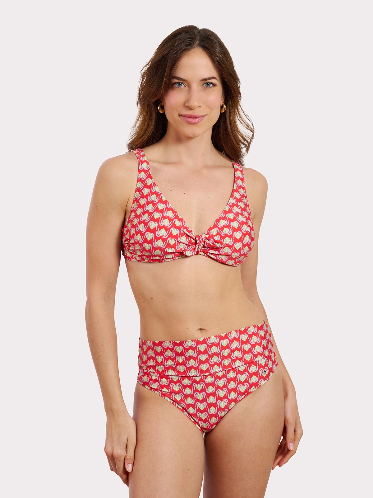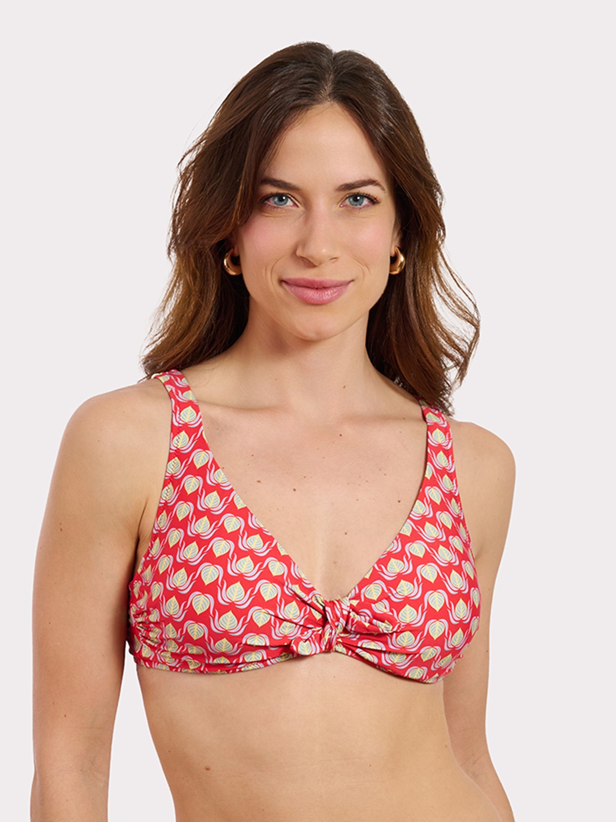 Sujetador de aro con tirantes, nuestro best seller, con cierre metálico plateado en espalda y lazo removible en el centro. Espectacular estampado en tonos rojos y lima con forro rosa.