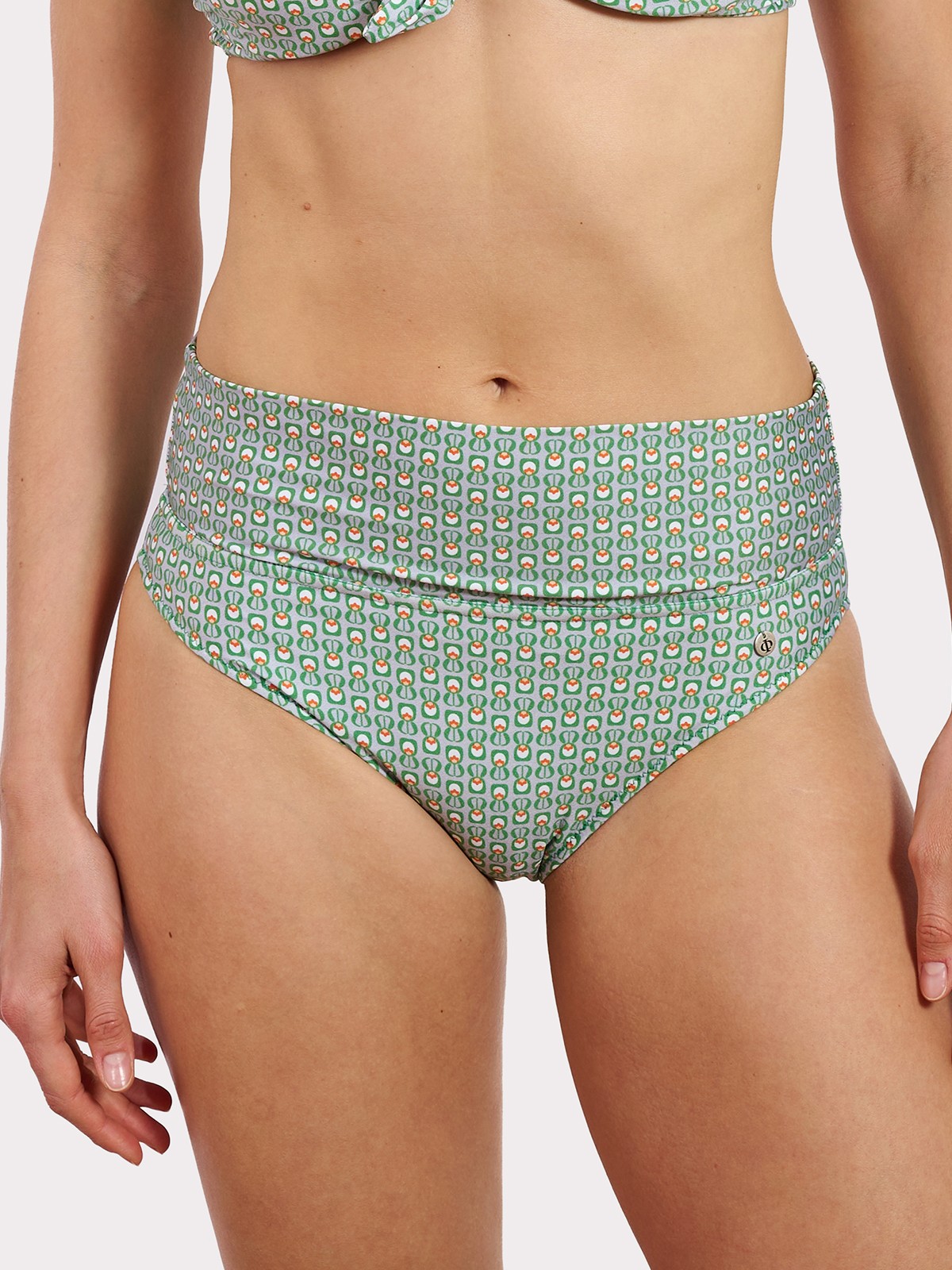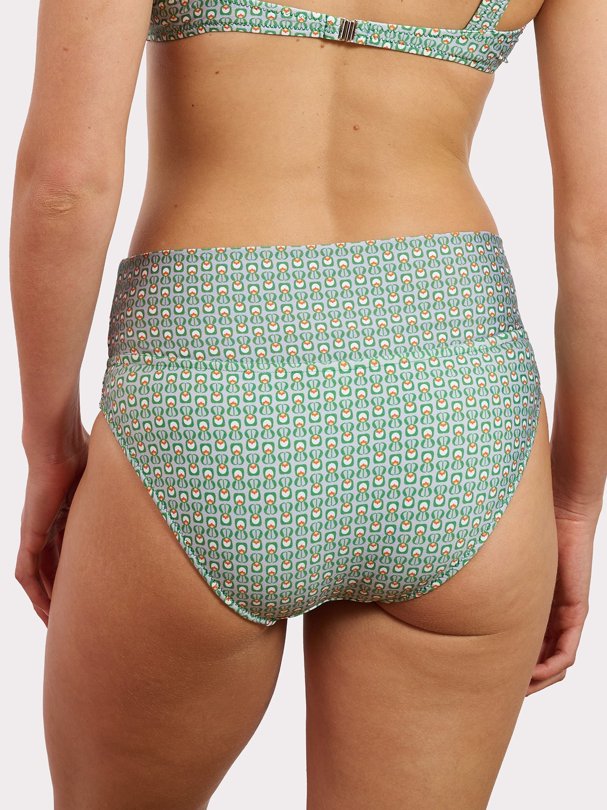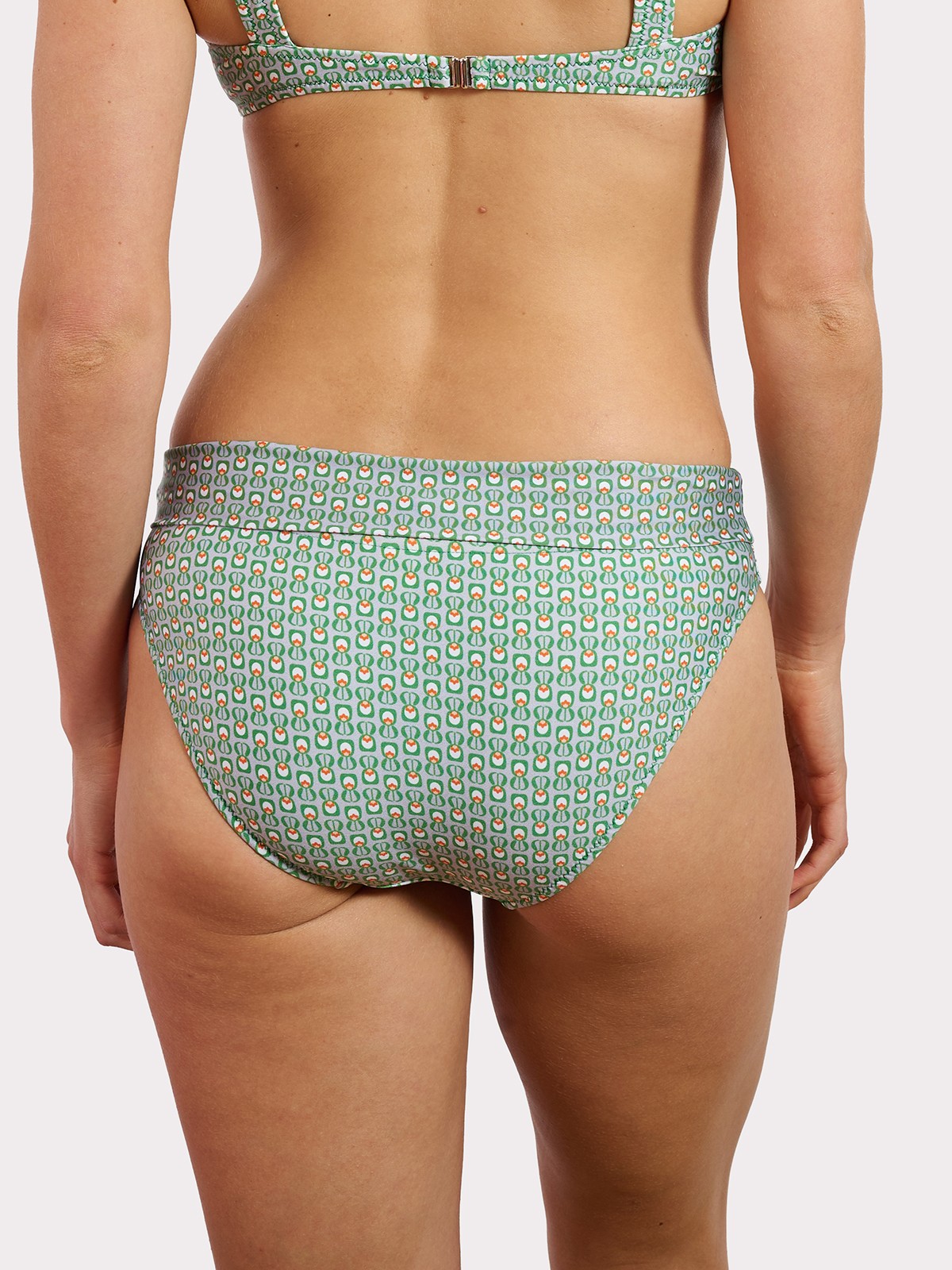 Braguita alta con vuelta, es nuestra braguita más cómoda, gracias a su fajín multiposición puedes llevarla doblada o sin doblar. Estampado geométrico de alegres tonos verdes y taupé y forro lima.